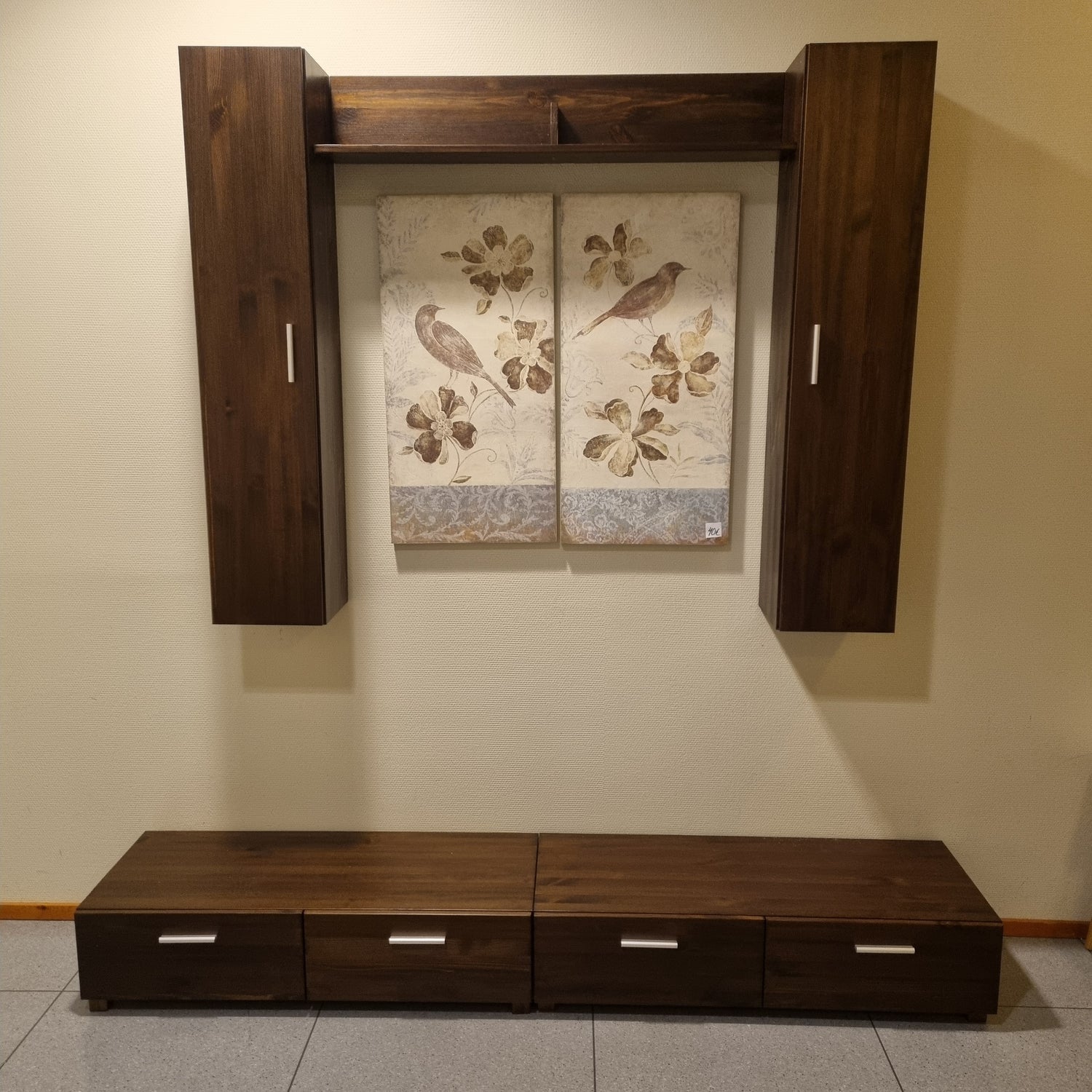 Suoralinjainen, massiivipuusta valmistettu Pinja-ryhmä, johon sisältyy kaksi tv-tasoa, kaksi kaappia sekä seinähylly.