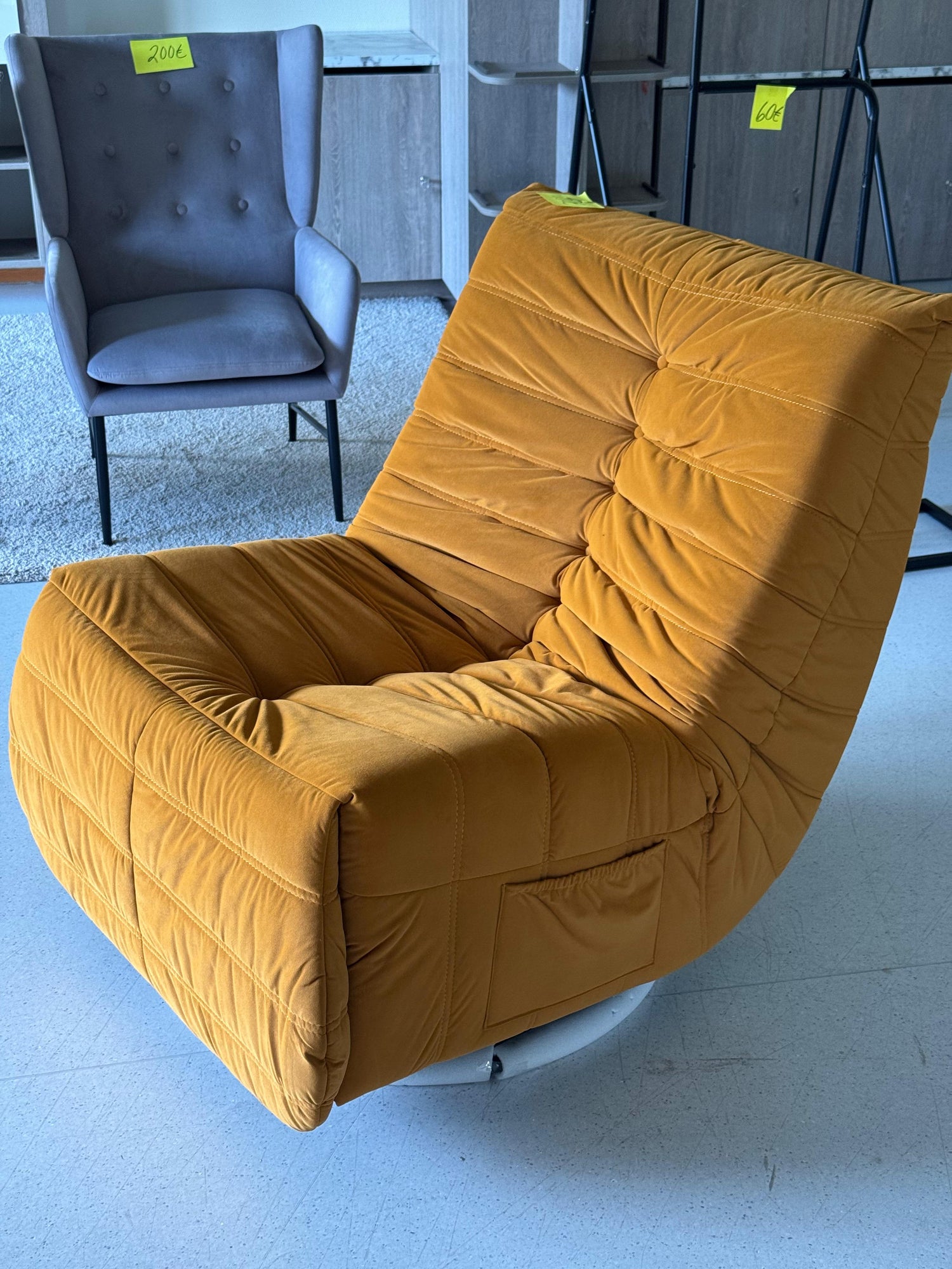 Yksittäis/ näytekappaleena upea okran värinen, samettipintainen mekanismituoli. Tuolin saa makuuasentoon, jolloin samalla jaloille nousee tuki tuolin etuosasta! Tämä on upea!