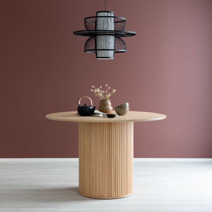 Upea, luonnonvärinen Verso-ruokapöytä, jonka jalka on koristeltu pyökkirimoilla. Pöydän runko on mdf-levyä ja tammiviilua. Kannen alapinta on vaneria. Pöydän halkaisija on 120 cm ja korkeus 75 cm.
