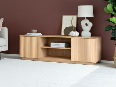 Upea, luonnonvärinen Verso tv-taso, jossa on kaksi kaappia sekä avohyllyt. Tv-tason runko on mdf-levyä ja tammiviilua ja sen ovet on koristeltu pyökkirimoilla. Kannen alapuoli sekä rungon ja ovien sisäpuolet ovat melamiinipinnoitteiset. Tv-tason leveys on 160 cm, syvyys 40 cm ja korkeus 50 cm.